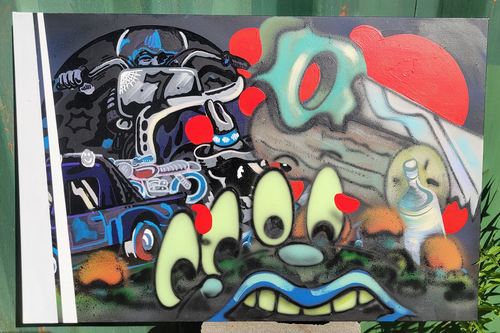 Muh Kaa Bruh handcrafted curiosities - spray paint mural on both sides & hand painted lettering 2024